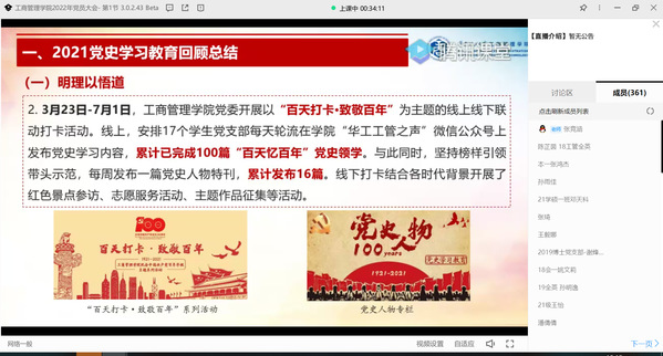 赓续血脉学党史,学思践悟开新局。会上,张竞涵老师向与会党员总结回顾了学院党史学习教育的具体内容,提出了下一阶段的工作计划。据了解,自开展党史学习教育以来,学院牢牢把握习近平总书记在党史学习教育动员大会上的重要讲话精神,在明理以悟道、增信以共情、崇德以修身、力行以践知等板块重点发力。通过打造学习阵地、创新学习载体、发挥头雁效应等形式,学院党委带头学党史、悟思想、办实事、开新局,各基层党团支部以学促知、以知促行、以行见效,带领广大师生掀起一波波党史学习热潮,形成了人人学党史、处处办实事的新格局,进一步坚定了广大党员的理想信念,提升了广大党员的责任担当。