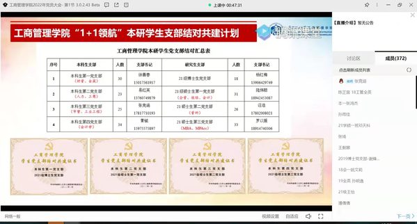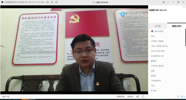 2022年1月14日,工商管理学院召开2022年学生党员大会。会议传达学习学校党史学习教育总结大会精神,回顾过去一年学院党史学习教育成效,部署新的一年学生党建计划,为新一年进一步巩固党史学习教育成果、持续发挥学生党员先锋模范带头作用、迎接党的二十大召开汇聚力量。学院党委副书记陈强、各年级辅导员与学院全体学生党员参加了此次会议。