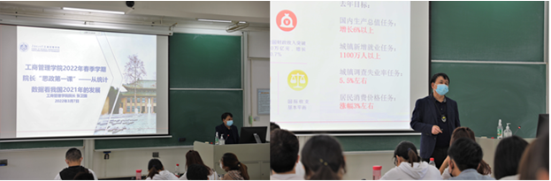为教育引导广大青年学子深刻认识以史为鉴、开创未来的重要要求,努力成长为习近平新时代中国特色社会主义思想的坚定信仰者和忠实实践者,2022年3月,张卫国院长、胡亦武书记分别以“从统计数据看我国2021年的发展”和“百年未有之大变局”为主题讲授了2022年春季学期“思政第一课”。工商管理学院2020级会计学2班全体本科生、本科生第四党支部全体党员及部分2019级、2020级入党积极分子代表参加了本次授课。