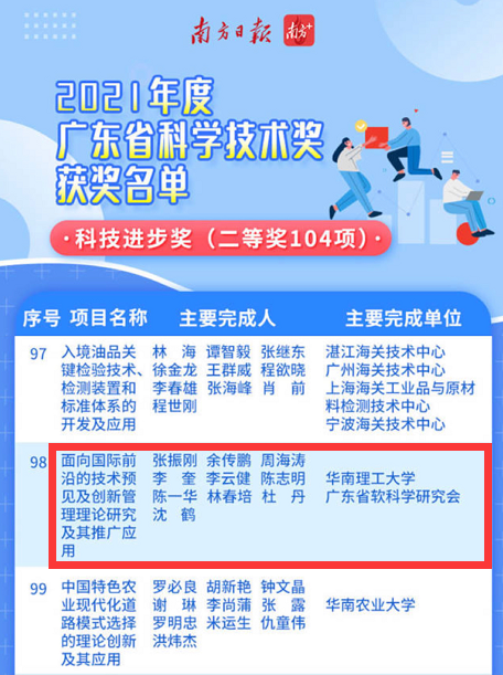 2022年4月15日,广东省科技创新大会颁发了2021年度广东省科学技术奖,张振刚教授团队以“面向国际前沿的技术预见及创新管理理论及其推广应用”项目荣获广东省科技进步奖二等奖。此次获奖是张振刚教授1995年获得广东省科技进步奖特等奖之后,再一次获得科技进步奖。