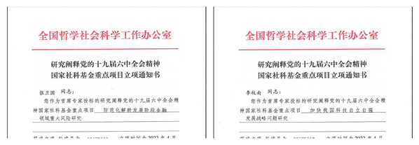 近日,全国哲学社会科学工作办公室下发了研究阐释党的十九届六中全会精神国家社科基金专项项目立项通知。学校共获批2项国家社科重点项目,均来自我院,分别是张卫国教授的“防范化解新发展阶段金融领域重大风险研究”项目及李牧南教授的“加快我国科技自立自强发展战略问题研究”项目。