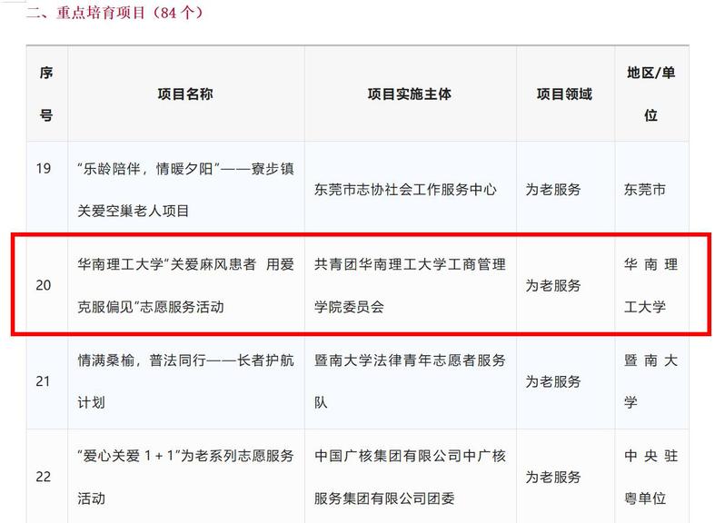 2022年9月14日,2022年“益苗计划”——广东志愿服务组织成长扶持行动暨志愿服务项目大赛在线上开展,共计825个来自地市、高校、省直单位有关单位组织推荐和社会自荐的项目激烈角逐。我院暑期三下乡志愿服务队申报的《华南理工大学“关爱麻风患者用爱克服偏见”志愿服务活动》服务项目参与比赛,最终在众多志愿服务组织中脱颖而出,荣获省级重点培养项目,同时也是我校唯一入围“益苗计划”并获奖的的志愿服务活动。