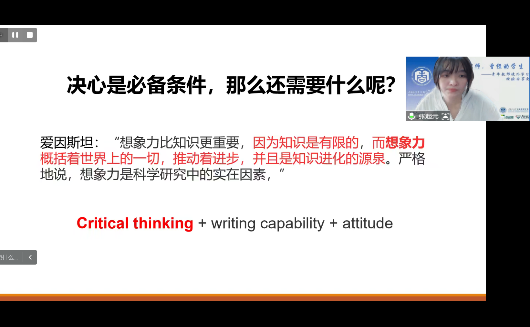 老师们的分享,展示了三种具有代表性的境外读博之路:直博、硕士-博士、联合培养,为同学们探索学术科研提供了路径选择。分享会上,同学们积极在线提问,三位老师细心聆听并作出详尽解答与中肯建议。“现在的老师,曾经的学生”,走过老师来时的路,带同学们领略不同的风景;沿着老师的足迹,助同学们直挂云帆、达心所愿。(图文/国际事务办公室)
