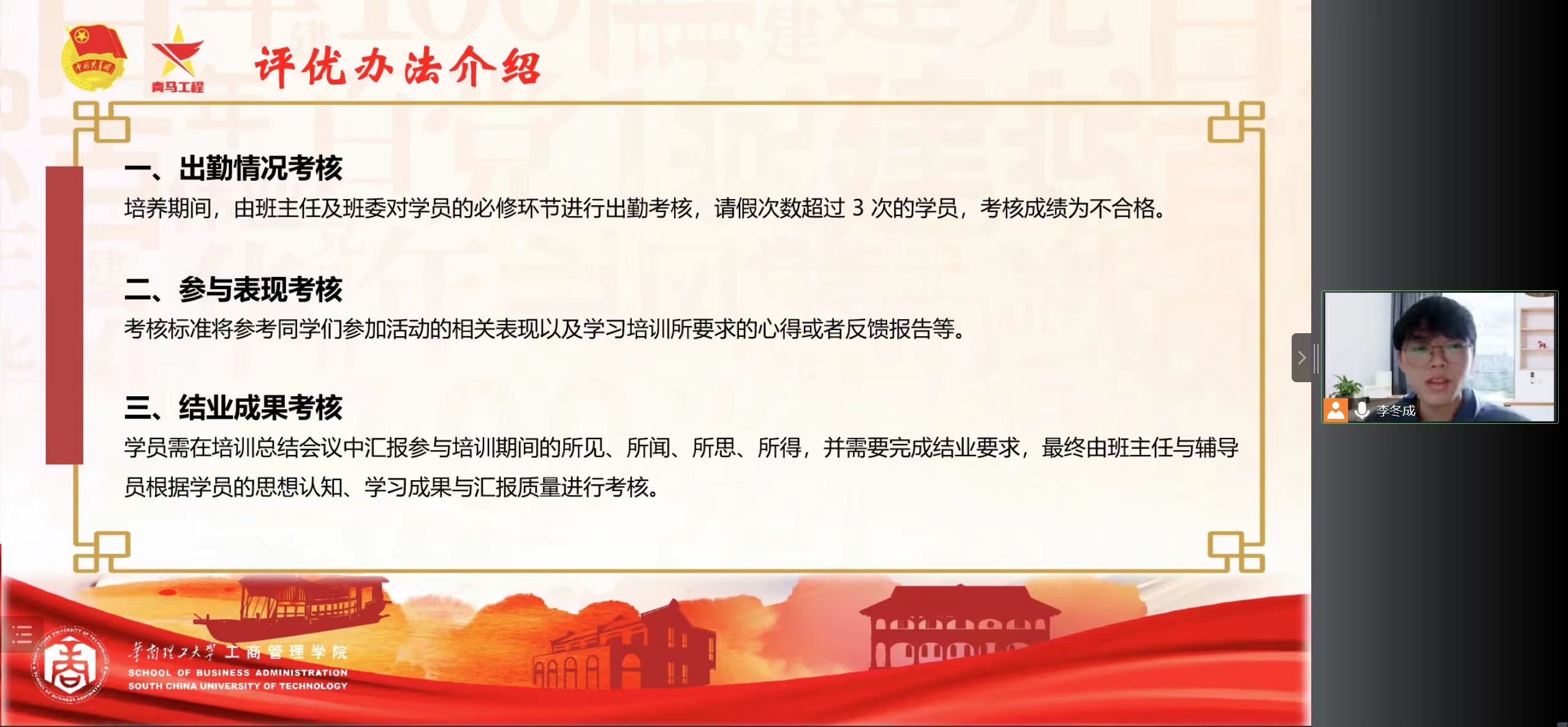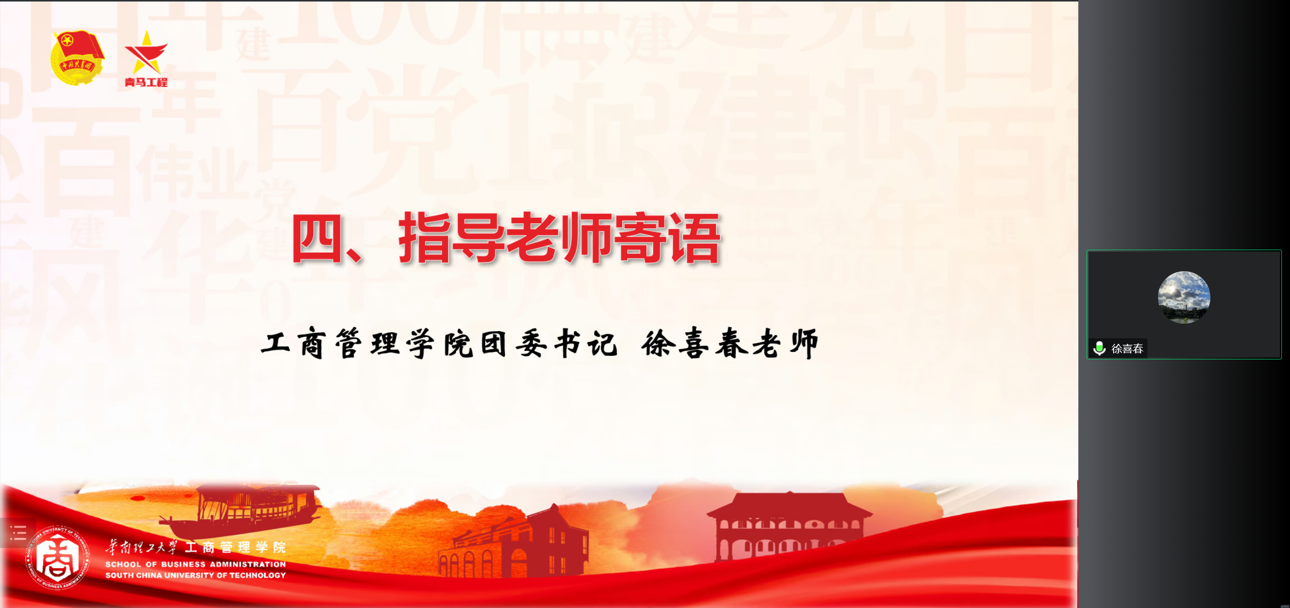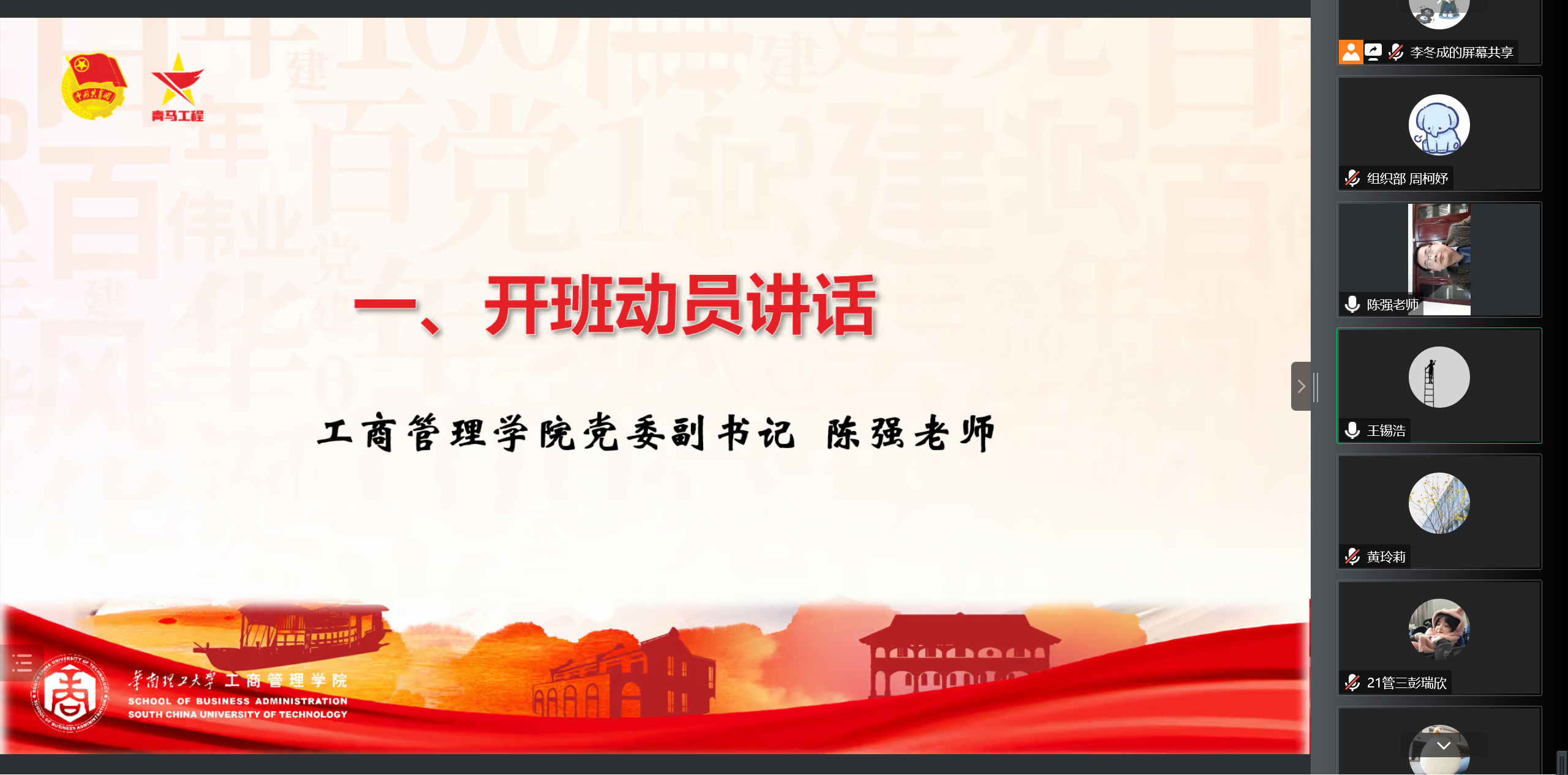 为深入学习贯彻习近平新时代中国特色社会主义思想和党的二十大精神,认真落实习近平总书记关于青年工作的重要思想,2022年12月15日,华南理工大学工商管理学院青年马克思主义者培养工程第一期培训班开班仪式在线上顺利举行。工商管理学院党委副书记陈强老师,学校党的二十大精神师生巡讲团成员、数学学院辅导员黄玲莉老师,工商管理学院团委书记徐喜春老师和来自学院第一期“青马班”的31名学员共同参加了会议。