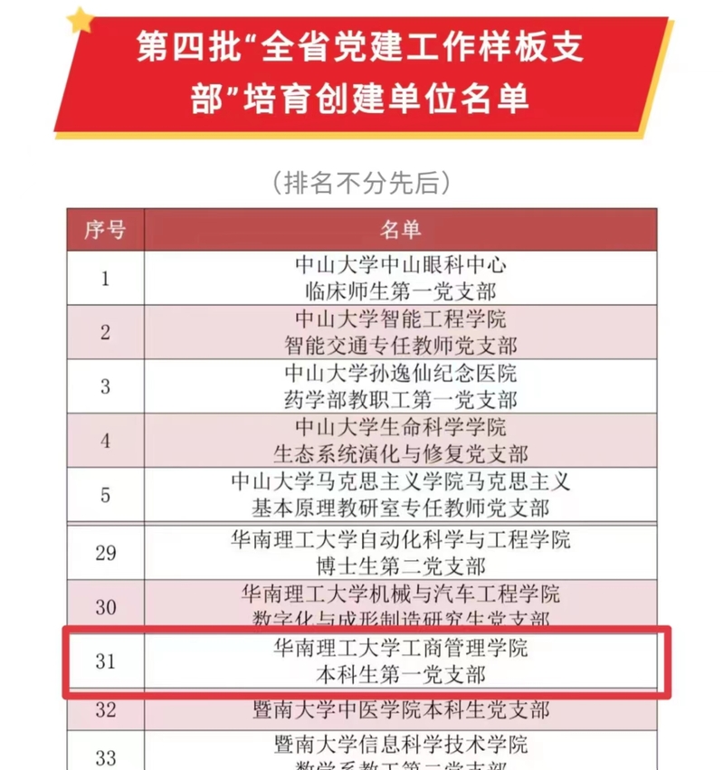 近日,广东省委教育工委公布了第四批全省党建工作示范高校、标杆院系、样板支部培育创建单位名单,其中工商管理学院本科生第一党支部入选“样板支部”,这也是工商管理学院首个获批省级样板的学生党支部。
