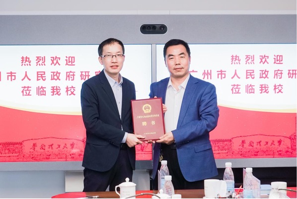 2023年3月17日下午,广州市政府研究室研究中心主任潘其胜、一级调研员蒋国学等专程莅临我校,与相关专家学者座谈交流,并代表广州市人民政府为我院两位教授颁发聘书,以期未来为广州经济高质量发展贡献智慧和力量。