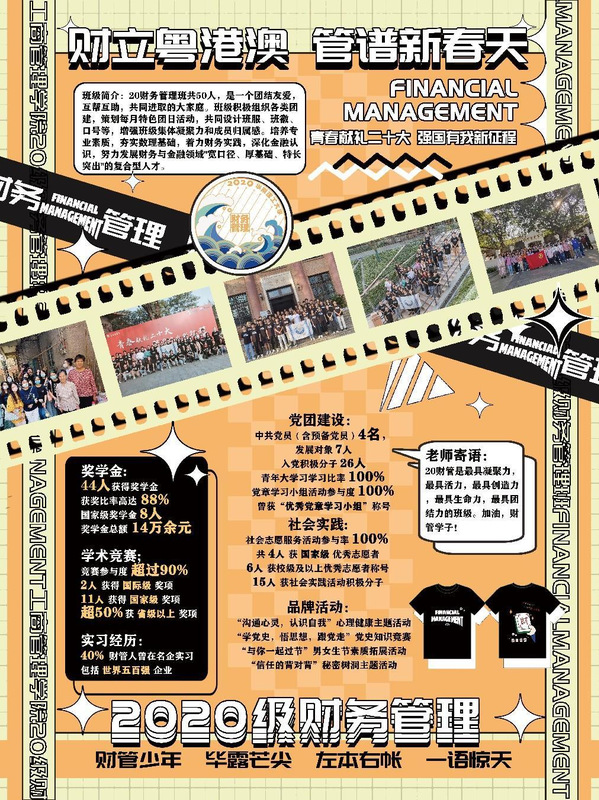 “财立粤港澳,管谱新春天”,在决赛中,2020级财务管理班结合专业特色,以“20财管融资介绍会”的创业形象出现,从学风建设、党团建设、学术科研、志愿服务等方面出发,多角度展现了班级携手并进的奋斗姿态:两年累计获得奖学金14万余元;超50%成员获省级以上奖项,其中11人次获国家级奖项,2人次获国际级奖项;社会志愿服务活动参与率100%,其中4人获国家级优秀志愿者,用实际行动彰显了财管学子争做“有理想、敢担当、能吃苦、肯奋斗”的新时代好青年的坚强决心。