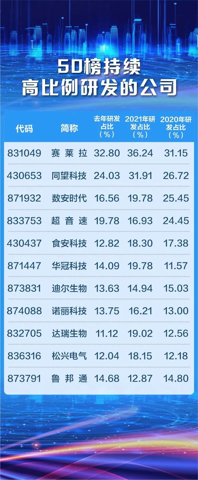 50榜单中还出现了一批持续高比例研发投入的公司。其中赛莱拉连续3年研发支出占比超过30%。
