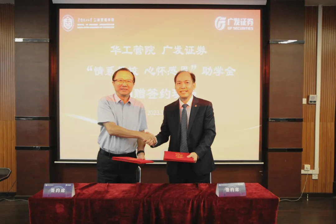 议程第一项,由广发证券社会公益基金会谭舜秘书长与华南理工大学党委常委、宣传部部长、工商管理学院党委书记邹浩签订捐赠协议书。