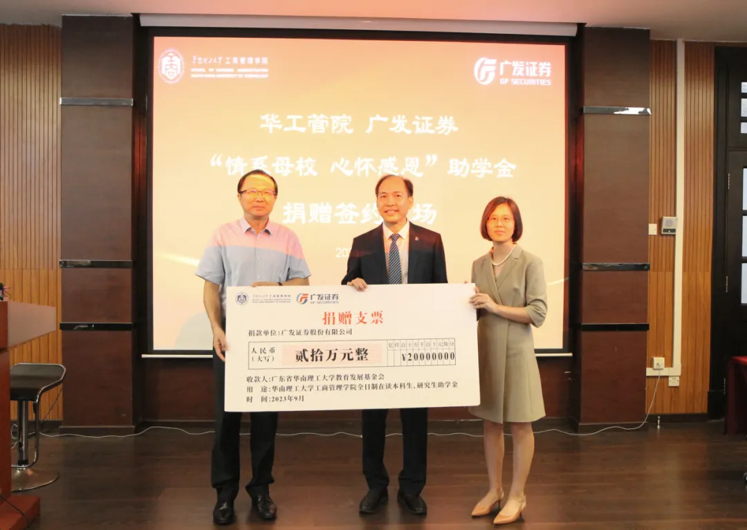 议程第二项,华南理工大学党委常委、工商管理学院党委书记邹浩代表学院接受来自广发证券总经理助理、广发证券社会公益基金会秘书长谭舜与欧亚菲校友共同捐赠的20万支票。