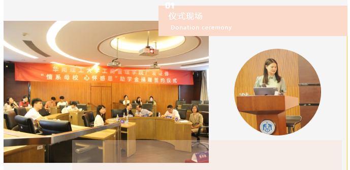 本次仪式由华南理工大学工商管理学院校友办主任吉美逸老师主持,她首先介绍了此次到场的学校领导和嘉宾,分别是:华南理工大学党委常委、宣传部部长、工商管理学院党委书记邹浩、华南理工大学工商管理学院院长许治、广发证券总裁助理、人力资源管理部总经理谭舜、广发证券党群工作部总经理张娜娜、广发证券发展研究中心执行董事、华南理工大学工商管理学院97级欧亚菲校友、广发证券党群工作部总监王岑岑以及广发证券党群工作部公益干事邱献威。另外还有20多名学生来到现场共同见证这一美好时刻。