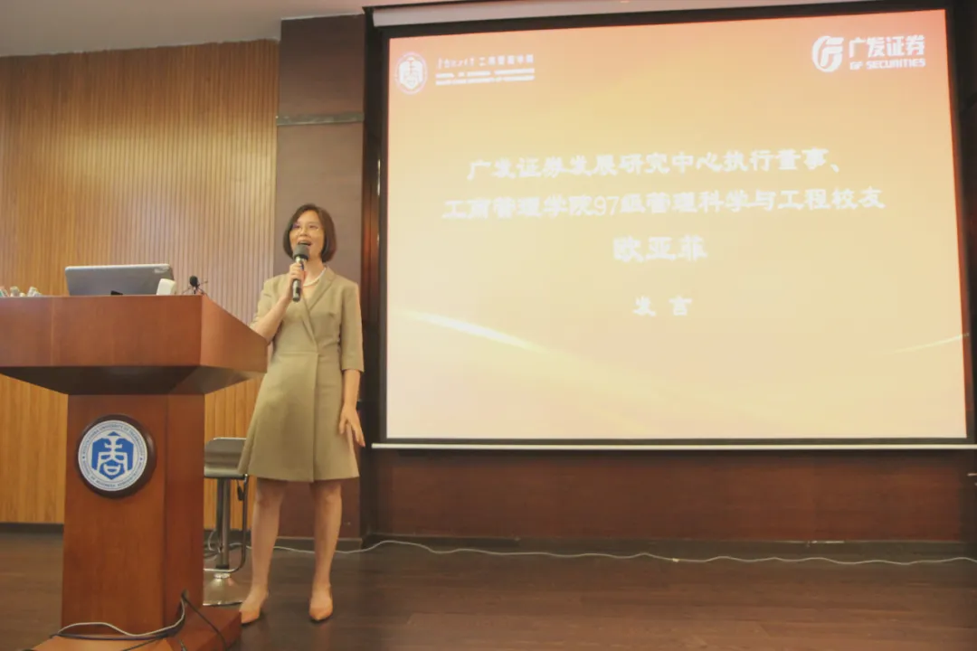 ▲ 广发证券发展研究中心执行董事、工商管理学院97级管理科学与工程 欧亚菲 校友讲话