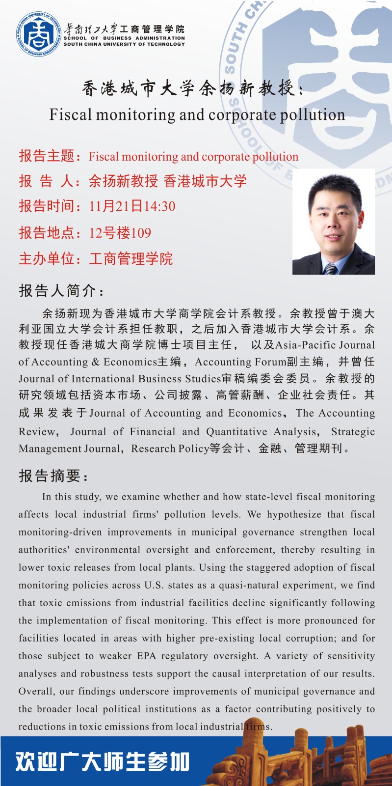 【学术交流报告】香港城市大学余扬新教授:Fiscal monitoring and corporate pollution