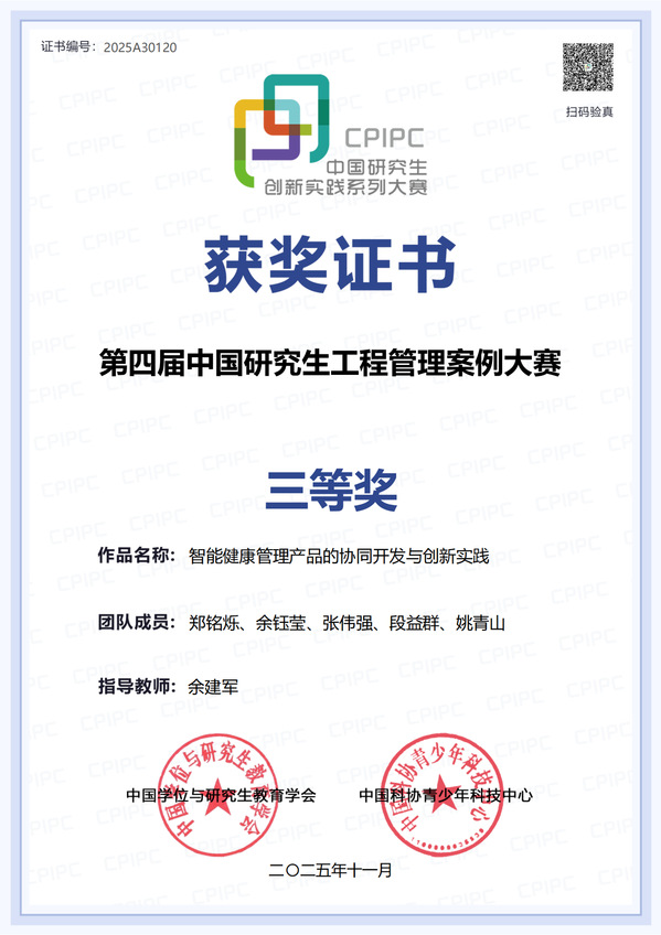余建军副教授指导的郑铭烁、段益群、余钰莹、姚青山、张伟强同学组成的“五山智行队”,创作的《智能健康管理产品的协同开发与创新实践》案例,聚焦健康管理领域技术融合与模式创新,通过医工协同开发,构建院家一体化全周期健康管理新范式,在医工融合赛道获国家三等奖。