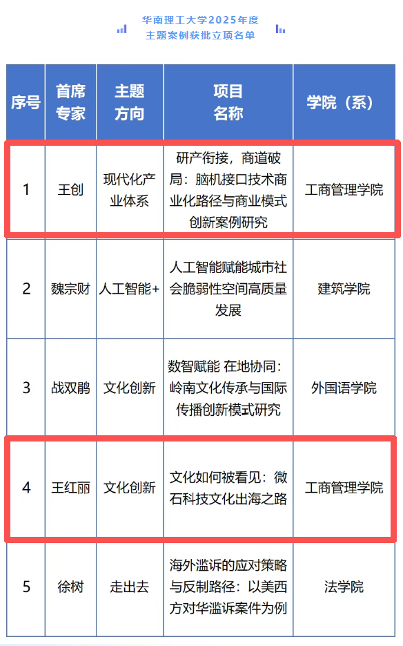近日,教育部学位与研究生教育发展中心公布了2025年度主题案例立项结果,我院王创教授团队提交的“现代化产业体系”主题项目“研产衔接,商道破局:脑机接口技术商业化路径与商业模式创新案例研究”,及王红丽教授团队提交的“文化创新”主题项目“文化如何被看见:微石科技文化出海之路”成功获批立项。