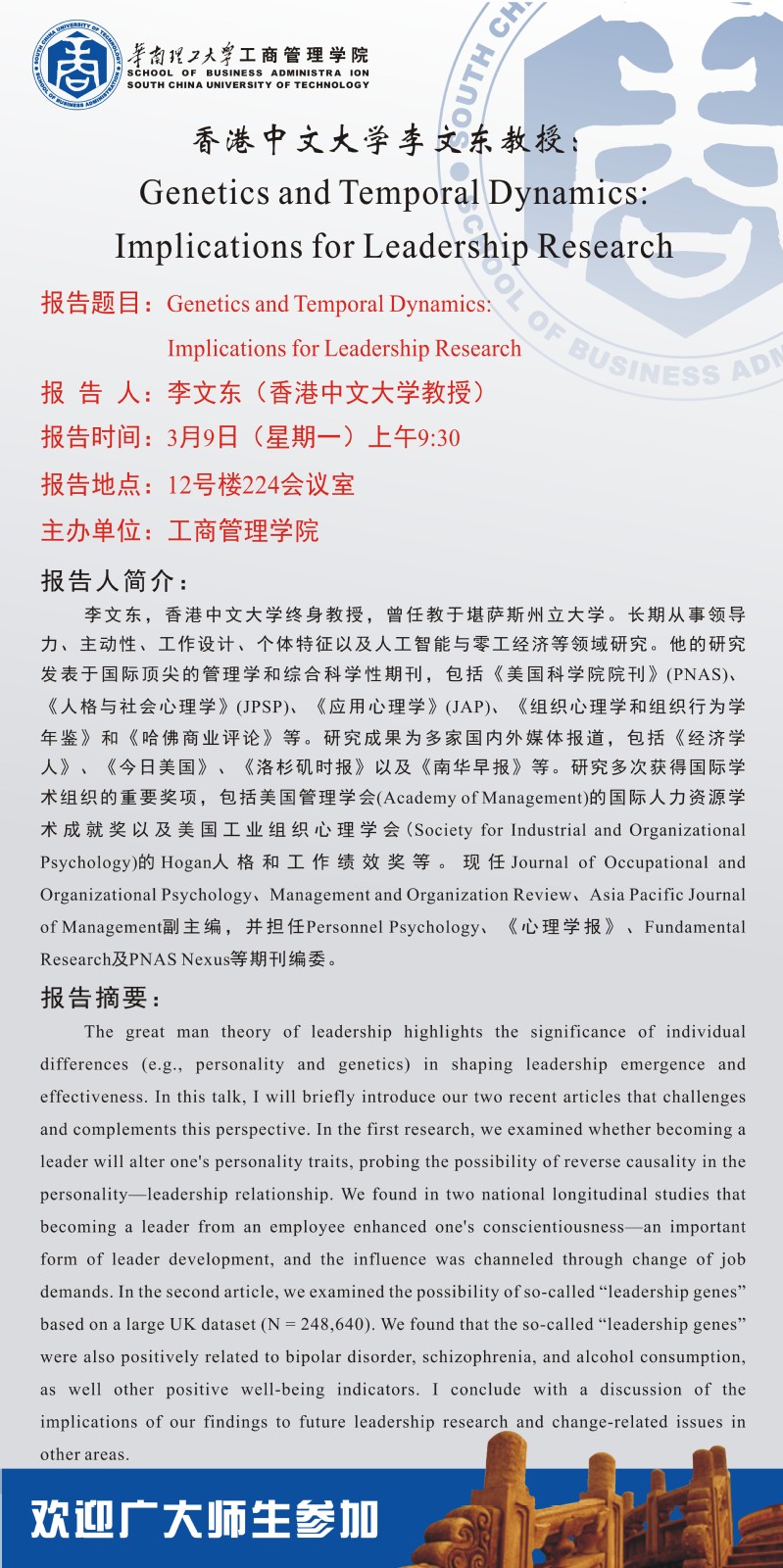 【学术交流报告】香港中文大学李文东教授: Genetics and Temporal Dynamics: Implications for Leadership Research