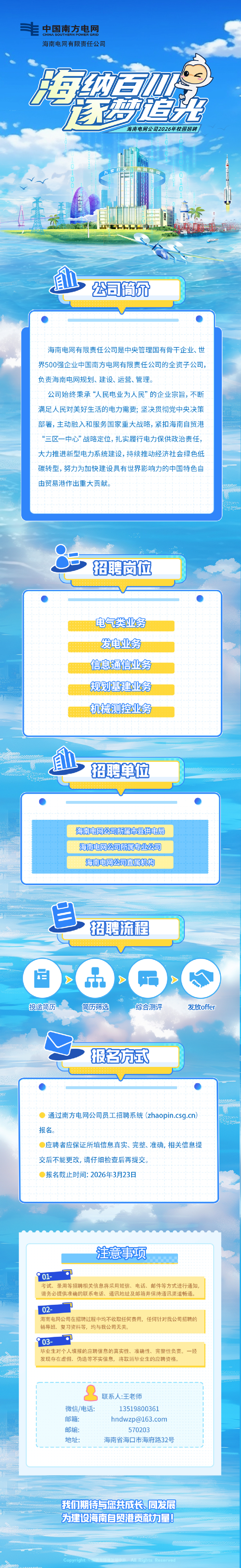 海南电网公司2026年春季校园招聘即将截止,诚挚邀请贵校学子踊跃投递简历,投身自贸港建设。本次春招对电气类专业需求量较大,恳请老师协助在电气相关院系及学生群内转发宣传,发动有意向的学生报名海南电网公司,报名截止时间2026年3月23日24:00。感谢老师对海南电网公司校园招聘工作的大力支持!