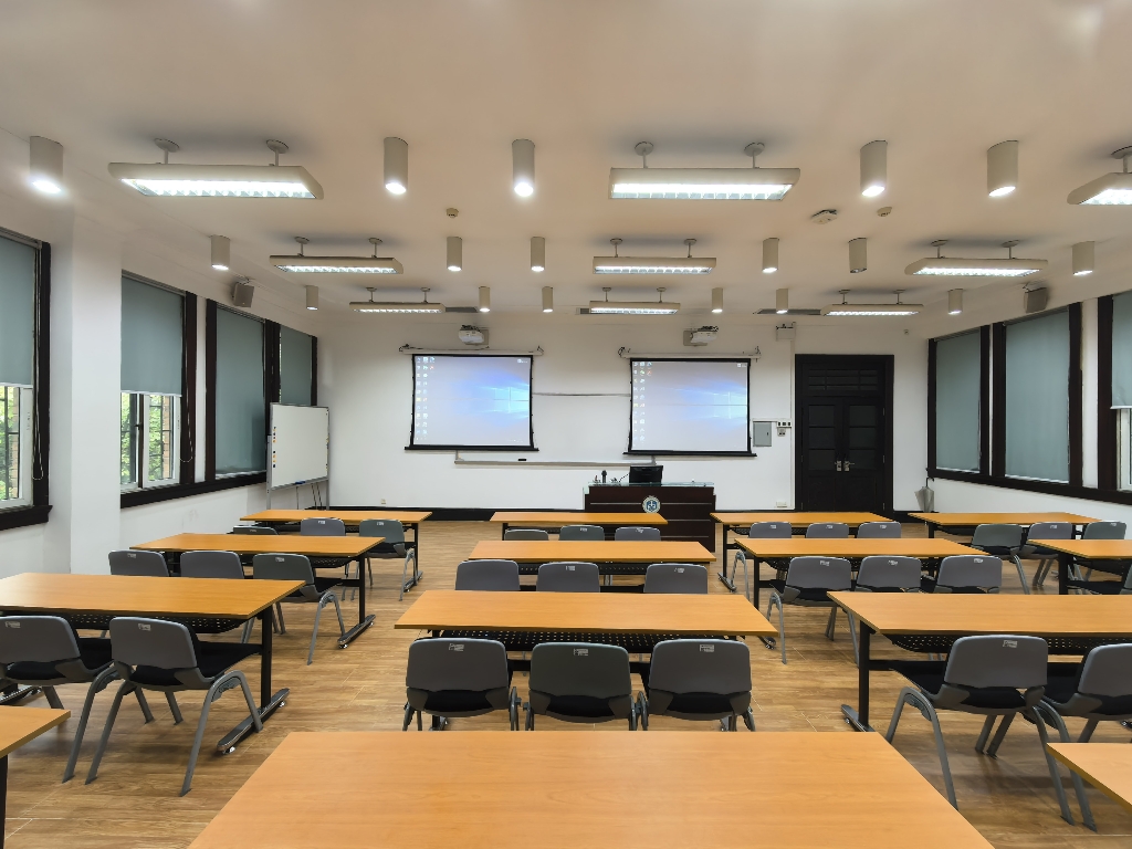 配备投影、音响、无线麦克风、白板、大班椅,支持互动式教学和小组学习。