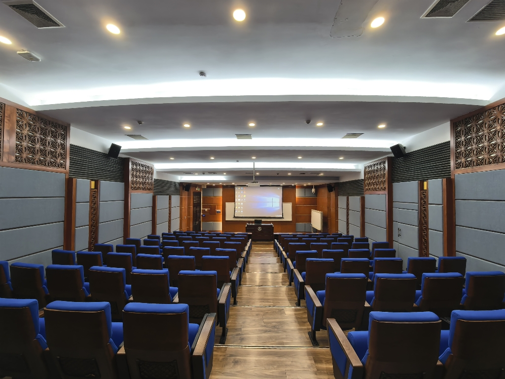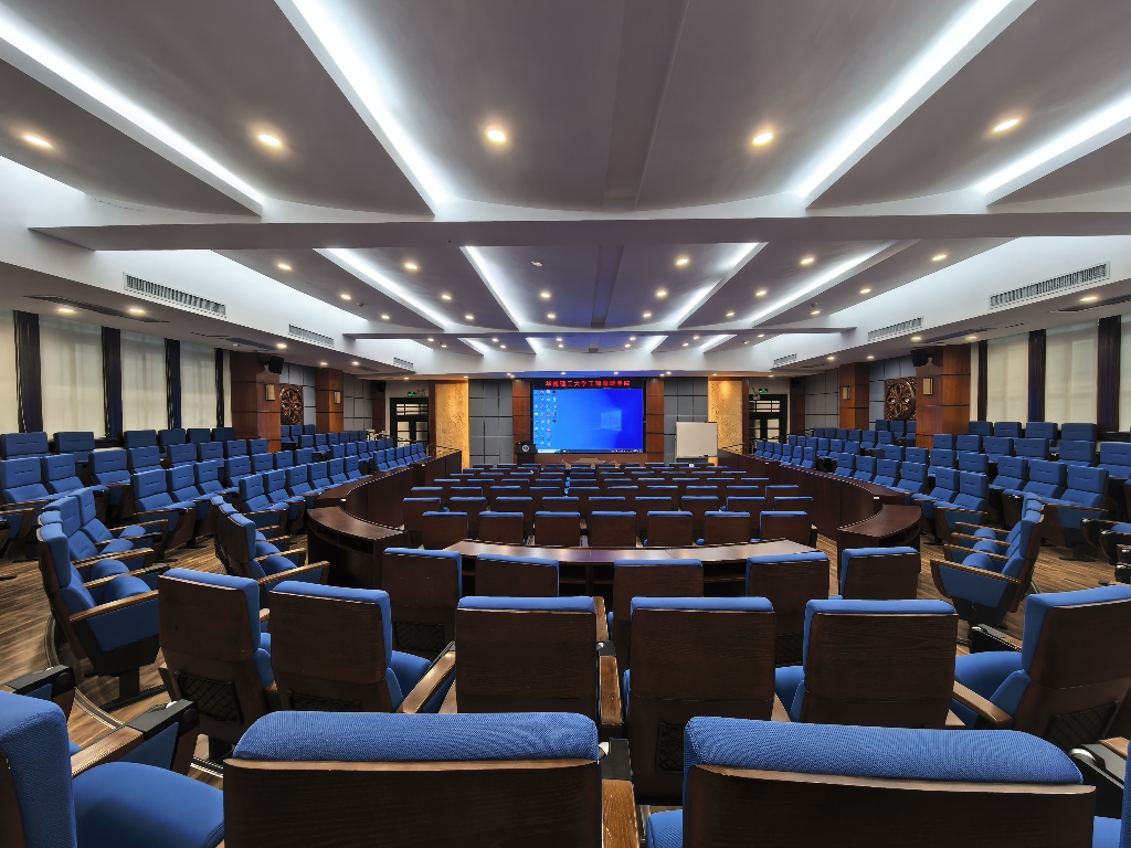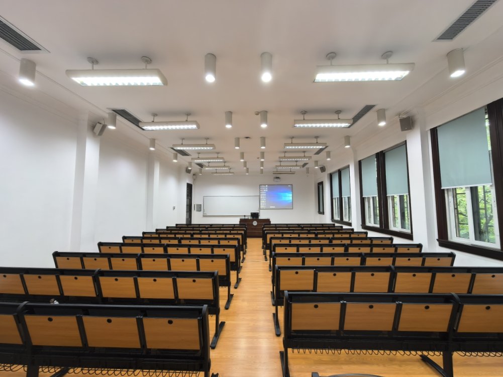 配备投影、音响、无线麦克风、白板、高级礼堂椅,适合讲座、教学和会议活动。