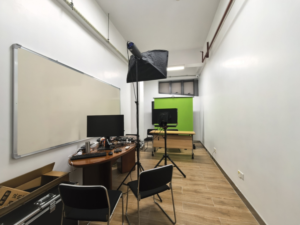 配备专业录音设备、摄像设备、绿幕背景和灯光系统,适合课程录制、线上教学视频制作、学术报告录制等多媒体制作需求。