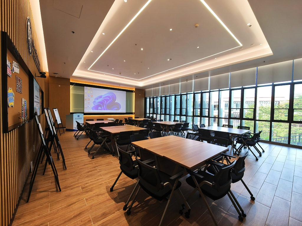 配备白板、投影设备和灵活座椅布局,适合小组讨论、头脑风暴和项目研讨。